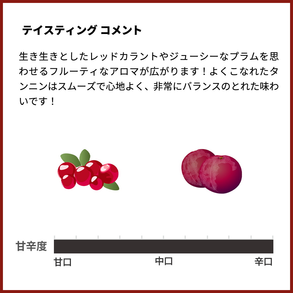 生き生きとしたレッドカラントやジューシーなプラムを思わせるフルーティなアロマが広がります!よくこなれたタンニンはスムーズで心地よく、非常にバランスのとれた味わいです!もちろん正規品の素晴らしい状態でお買い得価格で限定入荷!