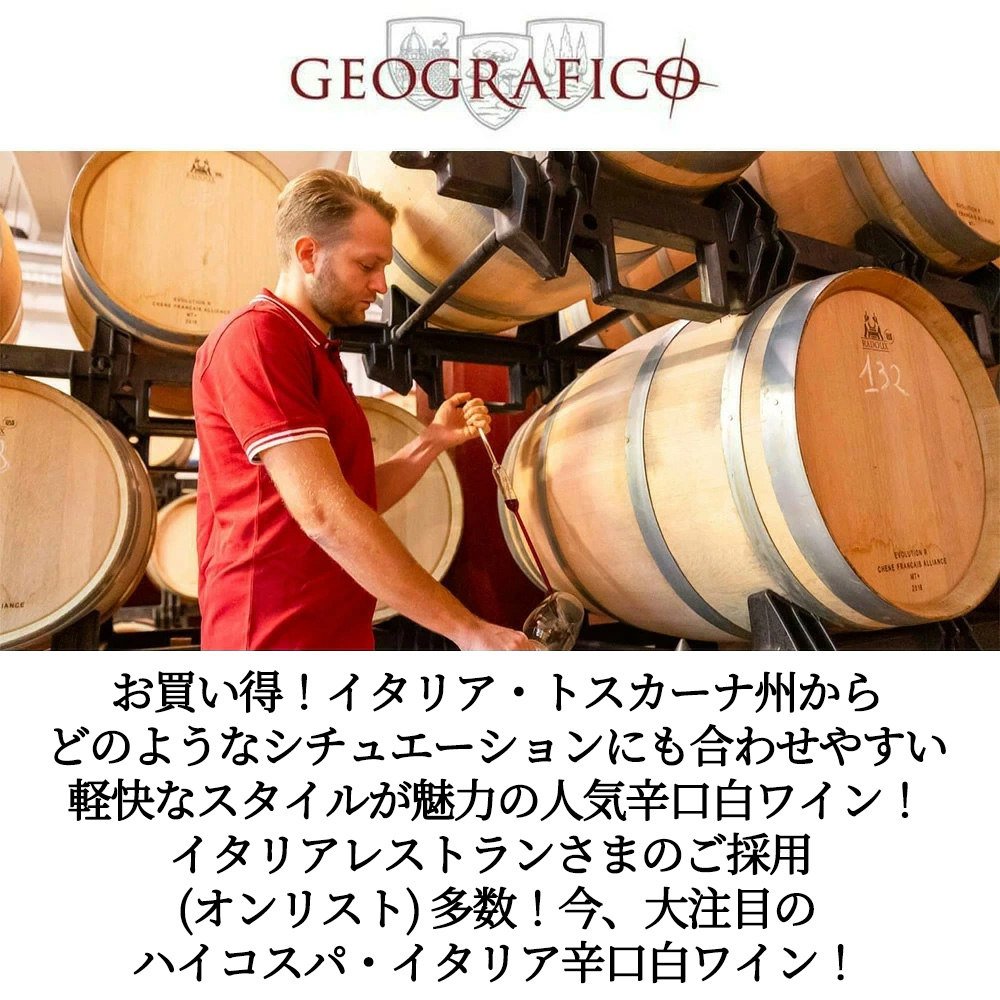 お買い得!イタリア・トスカーナ州からどのようなシチュエーションにも合わせやすい軽快なスタイルが魅力の人気辛口白ワイン!イタリアレストランさまのご採用 (オンリスト) 多数!今、大注目のハイコスパ・イタリア辛口白ワイン!造り手はトスカーナで約60年の歴史を持つ、注目の生産者組合のジェオグラフィコ!