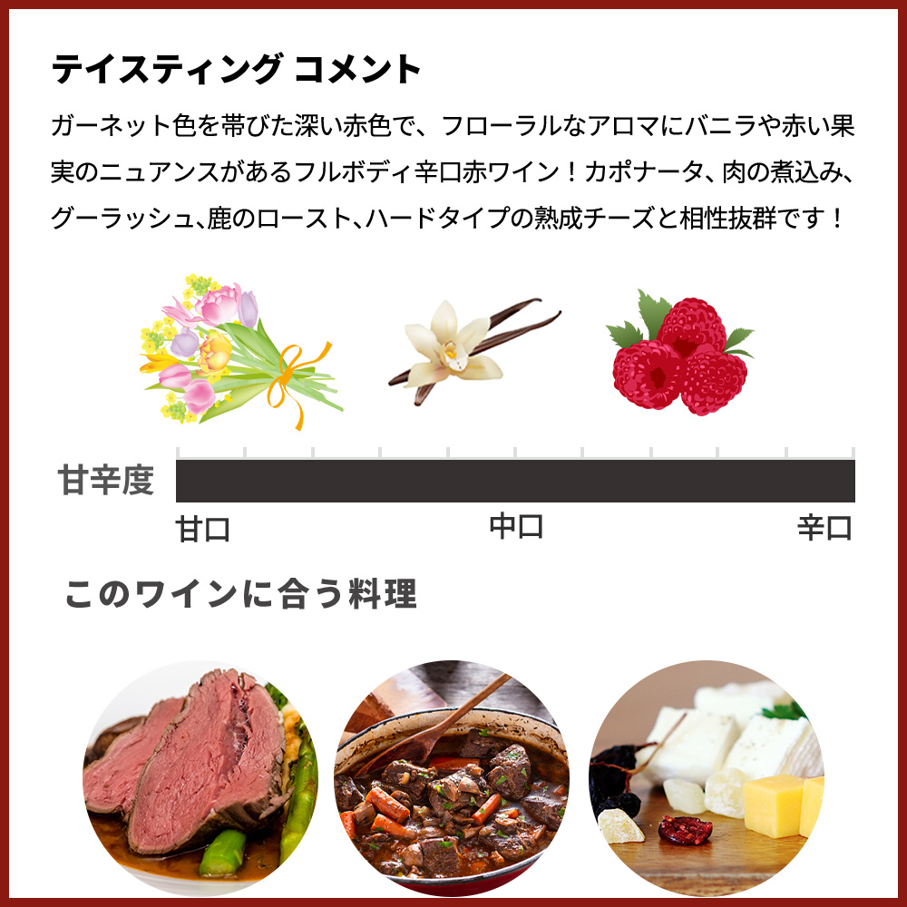 ガーネット色を帯びた深い赤色で、フローラルなアロマにバニラや赤い果実のニュアンスがあるフルボディ辛口赤ワイン!カポナータ、肉の煮込み、グーラッシュ、鹿のロースト、ハードタイプの熟成チーズと相性抜群です!