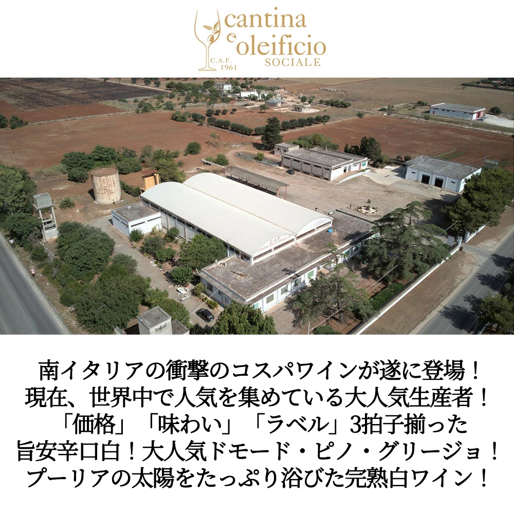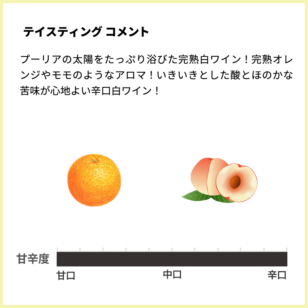 プーリアの太陽をたっぷり浴びた完熟白ワイン!完熟オレンジやモモのようなアロマ!いきいきとした酸とほのかな苦味が心地よい辛口白ワイン!旨安ピノ・グリージョが遂に登場!