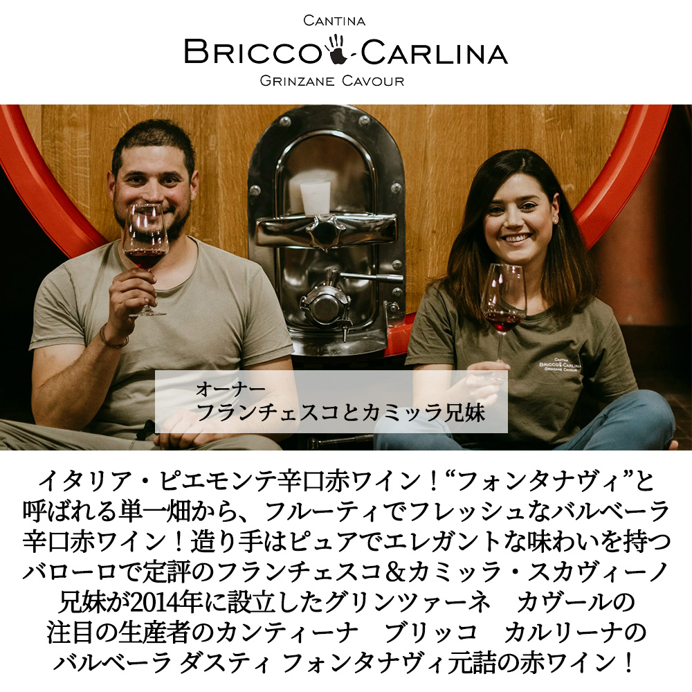 造り手はピュアでエレガントな味わいを持つバローロで定評のフランチェスコ&カミッラ・スカヴィーノ兄妹が2014年に設立したグリンツァーネ カヴールの注目の生産者のカンティーナ ブリッコ カルリーナ元詰赤ワイン!