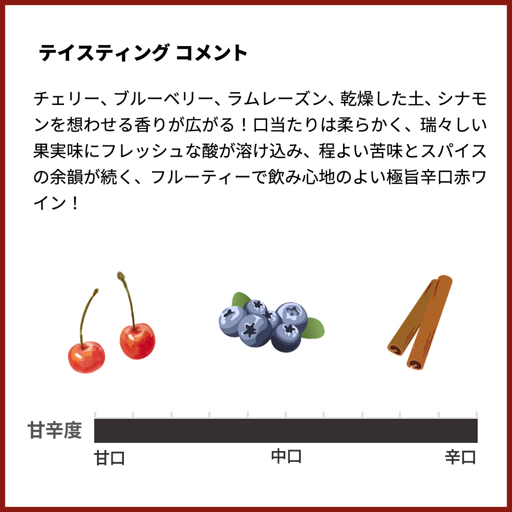 チェリー、ブルーベリー、ラムレーズン、乾燥した土、シナモンを想わせる香りが広がる!口当たりは柔らかく、瑞々しい果実味にフレッシュな酸が溶け込み、程よい苦味とスパイスの余韻が続く、フルーティーで飲み心地のよい極旨辛口赤ワイン!