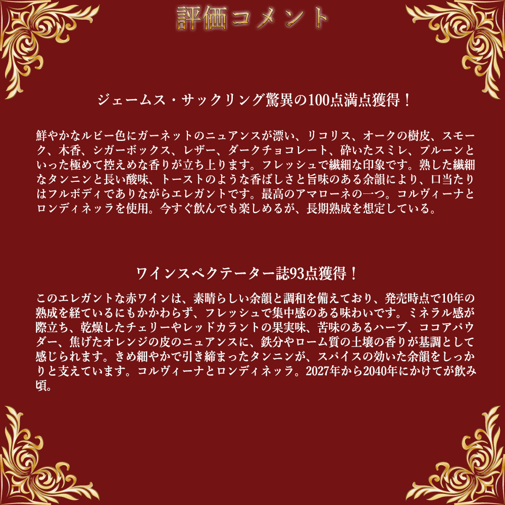 各ワインプレス激賞!この2015年でジェームス・サックリング驚異の100点満点で「Top 100 Wines of World 2024」第1位&「Top 100 Wines of Italy 2024」第1位の快挙!絶賛コメントは『鮮やかなルビー色にガーネットのニュアンスが漂い、リコリス、オークの樹皮、スモーク、木香、シガーボックス、レザー、ダークチョコレート、砕いたスミレ、プルーンといった極めて控えめな香りが立ち上ります。フレッシュで繊細な印象です。熟した繊細なタンニンと長い酸味、トーストのような香ばしさと旨味のある余韻により、口当たりはフルボディでありながらエレガントです。最高のアマローネの一つ。コルヴィーナとロンディネッラを使用。今すぐ飲んでも楽しめるが、長期熟成を想定している。』!