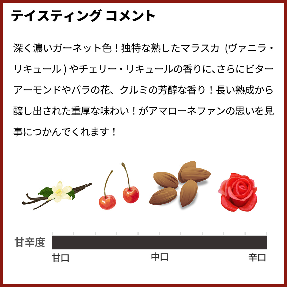 深く濃いガーネット色!独特な熟したマラスカ(ヴァニラ・リキュール)やチェリー・リキュールの香りに、さらにビターアーモンドやバラの花、クルミの芳醇な香り!長い熟成から醸し出された重厚な味わい!がアマローネファンの思いを見事につかんでくれます!