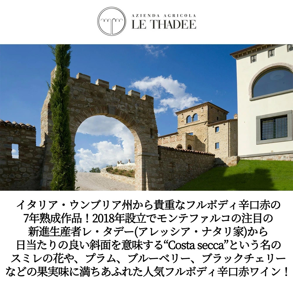 ウンブリア州の最高峰DOCGサグランティーノ・ディ・モンテファルコで注目される2018年設立の新進の注目生産者!レ・タデー(オーナー・アレッシア・ナタリ家)からウンブリアならではの個性的なワインで生き生きとした豊かな果実の味わいが楽しめるフルボディ辛口赤ワイン!
