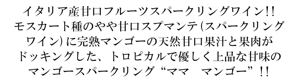 モスカートのスプマンテに完熟マンゴーの天然果汁と果肉がドッキングした爽快マンゴースパークリング。