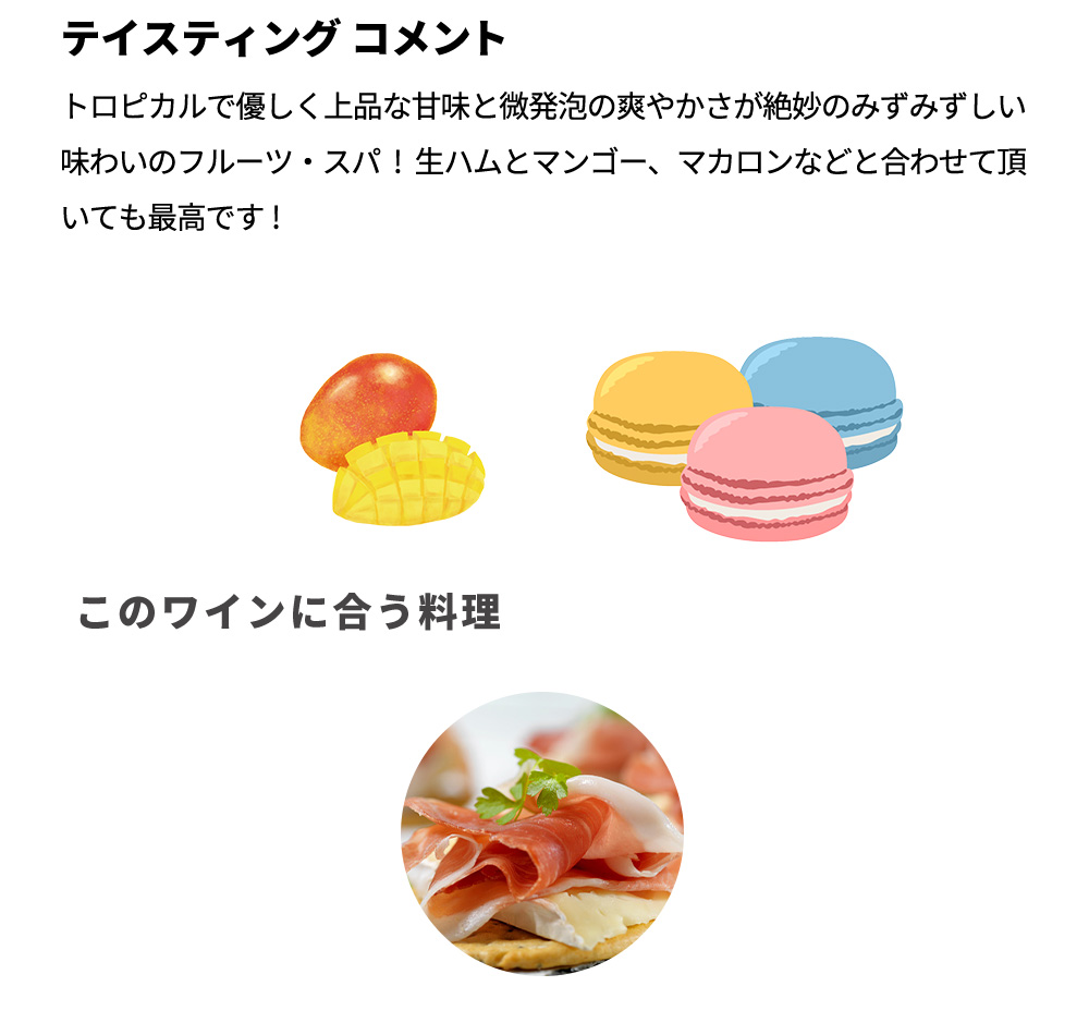 トロピカルで優しく上品な甘味と微発泡の爽やかさが絶妙の、みずみずしい味わいです。