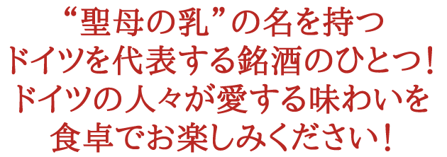 リープフラウミルヒ マドンナ 2021年 カビネット「マドンナ」のラベルにもある聖母「マドンナ」は、その深い愛情と美しさから母の象徴として愛され、信仰されています。 また、聖母「マドンナ」は、人々の幸せのためにさまざまな“奇跡”を起こす幸運のシンボルでもあります。聖母「マドンナ」の名前のワインを飲みながら、ちょっとした願いをかけてみてください。 あなたに、幸運がそっと舞い込むかもしれません。マドンナの魅力は、やさしく、ふっくらした果実のような味わいです。 爽やかなナシや熟したリンゴ、またレモンやライムを思わせる豊かな果実香が立ちのぼります。 皆様から愛されるその特長は活かし、更に香りを華やかに、よりリッチでフルーティな味わいを完成させました。 この絶妙な酸味と甘味のバランスこそが、マドンナが追い求めてきた理想の味わいです。フルーティでありながら、すっきりとしたおいしさの「マドンナ」は、和食との相性はもちろんのこと、スパイシーなエスニック料理や中華とも、抜群の相性です!そのやわらかい味わいは、冷やしてお飲みいただくとさらに際立ちます。いつもの食卓で、また、うれしいことがあった日のちょっと特別なお食事に、きりりと冷やした「マドンナ」で、幸せなひとときをお楽しみください。