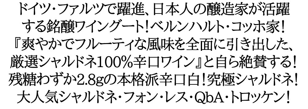 シャルドネ・フォン・レス・クーベーアー・トロッケン[2023]年 ■ぶどう品種:シャルドネ100% シャルドネの区画は南西向きで、標高182mのゆるやかな丘陵地帯にあり、土壌は石灰岩質土壌!収穫は畑で選別しながら手摘み100%!果実のアロマを引き出すため、発酵前に6度で4時間のスキンコンタクトを行います!発酵はステンレスタンクで18-21度にコントロールしながら行います!そのままステンレスタンクで6ヶ月熟成!清澄し、フィルターをかけてボトリング! このシャルドネ・フォン・レス・クーベーアー・トロッケン[2023]年はアプリコット、ミラベル、メロンの魅力的なアロマ!口に含むと力強く、そして爽快感があります!(坂田さんのコメント)→「多くの国で栽培されている品種ですが、ここハインフェルドの特徴である石灰をたくさん含んだ土壌の畑からのシャルドネをステンレスタンクで発酵させました。とても爽やかで口当たりがよく、メロン、アプリコット、白桃などのフルーティな風味を全面的に引き出した仕上がりになっています。」非常に珍しいドイツのシャルドネ100%辛口白ワイン