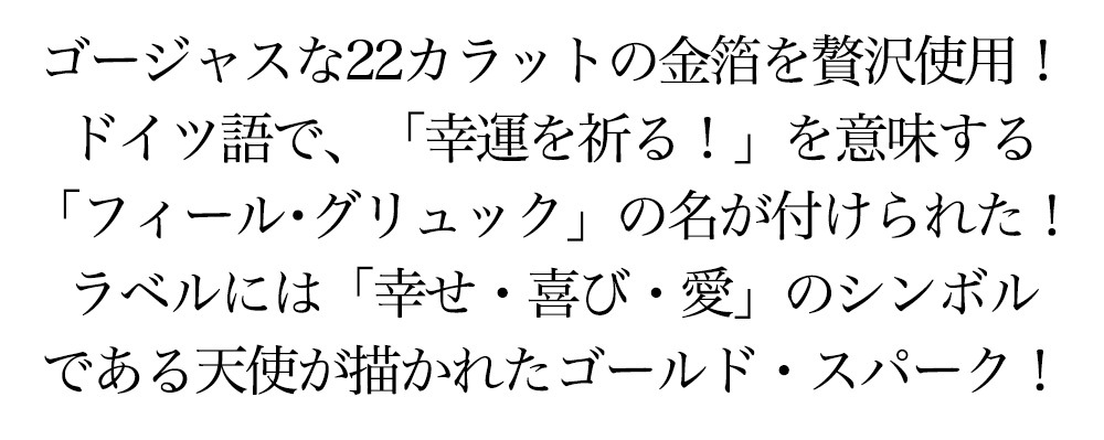 フィール グリュック ゴールド スパークリングワイン ■葡萄品種:トレッビアーノ/アイレン ■アルコール度数:11% トレッビアーノ、アイレンを使用し、ほんのり甘味を感じる飲みやすい味わい。 ライムとはちみつのアロマ。 ほのかに酸味もあるので、ワイン単体でも、お料理とも合わせやすいスパークリングワイン。 22カラットの金箔を贅沢に使用!天使が贈る、幸運の金箔スパークリング。 「フィール・グリュック!」とは「幸運を祈る!」を意味します。