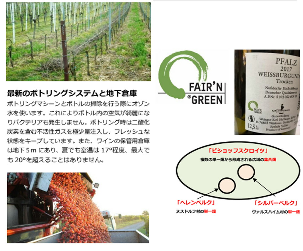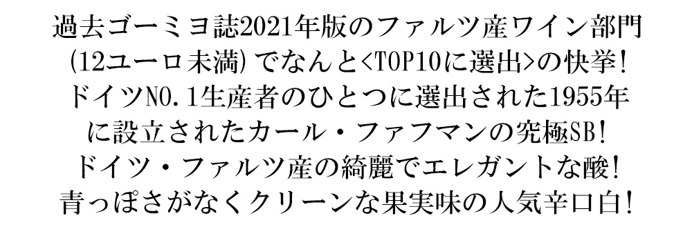 カール・ファフマン・ソーヴィニヨン・ブラン・ビショッフスクロイツ・クーベーアー・トロッケン[2023]年 ■葡萄品種:ソーヴィニヨン・ブラン ■平均樹齢:9年 ■土壌:石灰岩を含む砂質ローム ■残糖:7.3g/L ■酸度:6.5g/L このワインで過去ゴーミヨ誌2021年版のファルツ産ワイン部門(12ユーロ未満)で≪TOP10に選出≫! コストパフォーマンスの高さで定評のあるカール・ファフマンのラインナップにソーヴィニヨン・ブラン100%がついに登場! カール・ファフマンと言えば「ヴィヌム誌2019」で3ッ星、「ゴーミヨドイツワインガイド誌2019」で3房、「アインヒェルマン誌2019」で3星!2013年と2014年のラインラント・プファルツ州の品評会で、出品したすべてのワインの総合平均の高いワイングートに与えられる「Staatsehrenpreis スターツエーレンプライズ(特別栄誉賞)」を受賞! 「ファインシュメッカー誌」で、2014ドイツNO.1生産者のひとつに選出! ワインプレスの評価もうなぎ登り!ソーヴィニヨン・ブランは、2000年からドイツで最も重要な葡萄品種のひとつとなりました! 葡萄はヌスドルファー ビショッフスクロイツ畑100%使用しています!