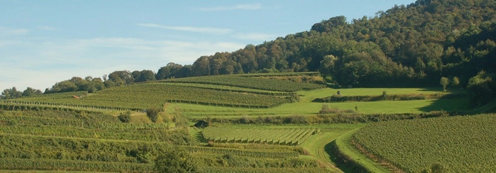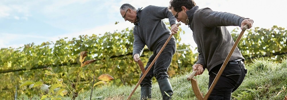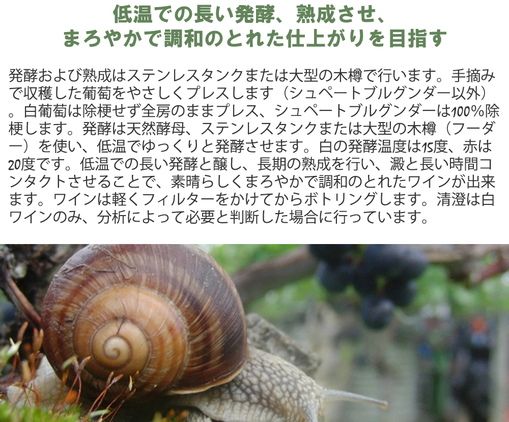 設立当初から、自然を尊重した葡萄栽培を実践 土壌はカイザーシュトゥールの特徴である火山性で、風化した火山岩の礫、レス(黄土)、ロームがみられます。栽培する品種は、シュペートブルグンダー、ヴァイスブルグンダーがメインですが、その他にシャルドネ、ルーレンダー、オーセロワ、ソーヴィニヨン ブランも栽培しています。畑では化学的なものを避け、自然な栽培を実践しています。殺虫剤を使用せず、また畑の肥料は馬の糞を使います。冬の間、畑には自然の草を生やしておきます。夏は、益虫にとって良いとされるファセリア(ハゼリソウ)やソバを生やしています。所有する畑は6.8haですが、これ以上広げるつもりはありません。自分達で細部まで気を配り、自分自身の手で作業が出来る範囲に留めておきたいと考えているためです。
