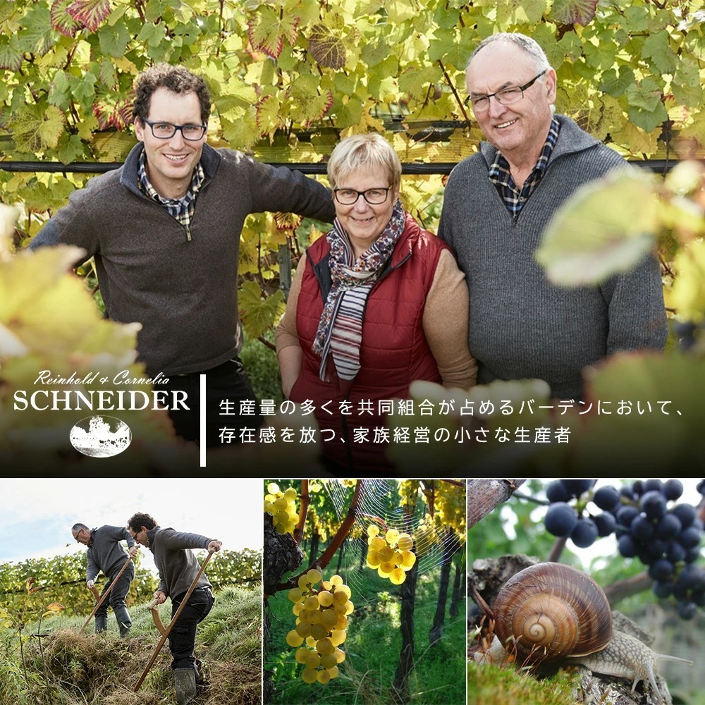 生産量の多くを共同組合が占めるバーデンにおいて、 存在感を放つ、家族経営の小さな生産者 1981年にラインホールトとコーネリアのシュナイダー夫妻が地元の生産者組合を離れ、バーデン南部、カイザーシュトゥールのエンディンゲン村に自分達のワイングートを立ち上げました。2002年からは、ファルツで研修をしていた息子のアレクサンダーもワイン造りに加わるようになりました。設立当初から殺虫剤や化学肥料を使用せず、自然を尊重した葡萄栽培を行っています。所有する畑は合計で6.8haです。彼らは、ドイツの中で最も暖かい気候とカイザーシュトゥールの火山性土壌に適したシュペートブルグンダー、ヴァイスブルグンダーなどブルグンダー系の品種に力を入れており、「ゴーミヨドイツワインガイド2020」で3房、「ヴィヌム2020」で4ツ星など高い評価を得ています。また「ワールド アトラス オブ ワイン第7版」でカイザーシュトゥールの最高の栽培家のひとつに名前を挙げられています。