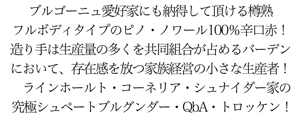 シュペートブルグンダー クーベーアー トロッケン 2019 ■ぶどう品種:ピノ・ノワール100% ■熟成・発酵:2,500Lの木製の大樽に入れ、天然酵母を使い20度の低温で約25日間発酵/同じ大樽で24ヶ月熟成 ブルゴーニュファンにも納得して頂ける樽熟フルボディタイプのピノ・ノワール100%辛口赤ワイン!バーデン産の希少なピノ・ノワール100%で造られる(火山性土壌から生まれる)やわらかくフルーティな味わい! しかも造り手は生産量の多くを共同組合が占めるバーデンにおいて、存在感を放つ、家族経営の小さな生産者!「ゴーミヨドイツワインガイド誌2020」で3房、「ヴィヌム誌2020」で4ツ星など高い評価!また「ワールド・アトラス・オブ・ワイン第7版」でカイザーシュトゥールの最高の栽培家のひとつに名前を挙げられるバーデンにおいて存在感を放つ、家族経営の小さな生産者ラインホールト・コーネリア・シュナイダー家の元詰ワイン! ブラックベリーやブルーベリーの果実のアロマ!口に含むとかすかにローストの風味を感じます!タンニンはしなやかで洗練された味わいがあります!ブルゴーニュ・ピノ・ノワール100%ファンは是非一度お試し下さい!