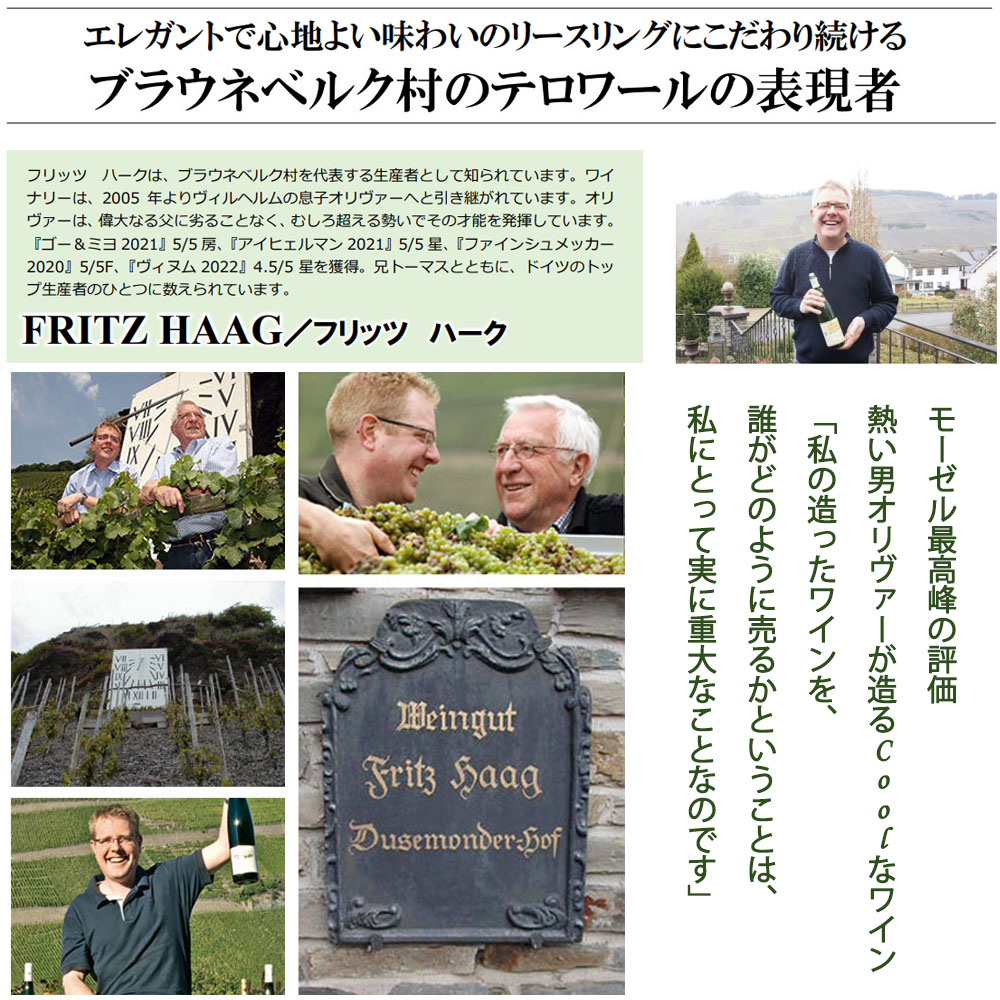 ブラウネベルガー・ユッファー・ゾンネンウーア・グローセス・ゲヴェックス(G・G)・リースリング・トロッケン[2021]年・蔵出し・フリッツ・ハーク家元詰 ■ぶどう品種:リースリング100% ■樹齢:70~110 年樹齢 造り手のフリッツ・ハークは、ブラウネベルク村を代表する生産者として知られています!ワイナリーは、2005年よりヴィルヘルムの息子オリヴァーへと引き継がれています! オリヴァーは、偉大なる父に劣ることなく、むしろ超える勢いでその才能を発揮しています! なんと!「ワイン&スピリッツ 2023冬」96点、「アイヒェルマン 2023」92点、「ヴィヌム 2023」91点、「ジャンシス ロビンソン.com」17+点、「デカンター 2023.8」92点を獲得!