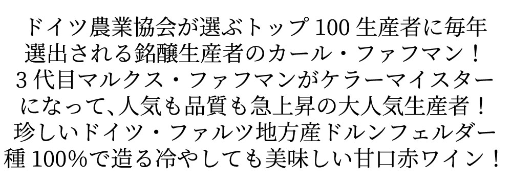 レッド ヴィンヤード ドルンフェルダー 2022 蔵出し品 カール ファフマン元詰 3代目ケラーマスター マルクス ファフマン家 赤 甘口 ■ぶどう品種:ドルンフェルダー種100% ■土壌:レス(粘土)とロームが主体 ■発酵:温度コントロールされたステンレスタンクで発酵 「DLG TOP100 WEINERZEUGER 2020」ドイツ農業協会が選ぶトップ100生産者の29位に選出!「ヴィヌム2019」で3ッ星、「ゴーミヨドイツワインガイド2019」で3房、「アインヒェルマン2019」で3星! 「ラインラント ファルツ州品評会 2020」通算19回目となるスターツエーレンプライズ(特別栄誉賞)を受賞!『ファインシュメッカー2014』 ドイツNo.1生産者に選出! DLG(ドイツ農業協会)が選ぶ「トップ100生産者2020(29位)」に、2019年(29位)、2018年(33位)に続き3年連続で選出のカール・ファフマン元詰(3代目ケラーマスター・マルクス・ファフマン家)! ワインに豊かなフレイバーを持たせるため、畑で何度も不要な房を落とし、収量制限を行います!そうすることで残された葡萄に多くの栄養分が行きわたり、一粒、一粒のフレイバーが集約されます! 珍しいドイツ・ファルツ地方産ドルンフェルダー種100%甘口赤ワインが待望入荷!