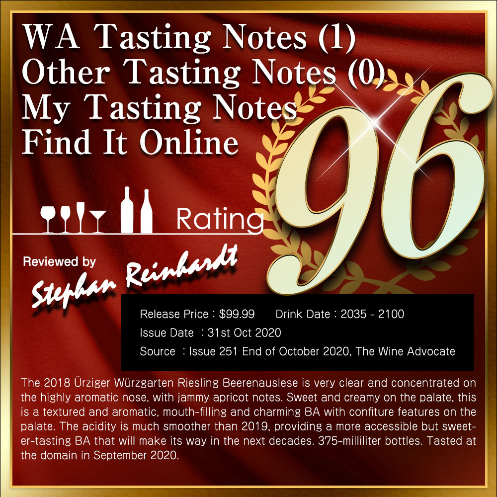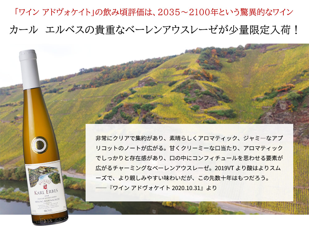 【ハーフサイズ】ユルツィガー ヴュルツガルテン リースリング ベーレンアウスレーゼ 2018 カール エルベス家元詰 375ml ■ぶどう品種:リースリング種100% ■発酵・熟成:3ヶ月発酵、3ヶ月熟成 ■残糖:260.1g/L ■酸度:7.8g/L ドイツ・モーゼル最高級極甘口白ワイン愛好家垂涎!中部モーゼルでも指折りの生産者として評価を得ているカール・エルベス家(現当主ステファン・エルベス)による貴重な蔵出しベーレンアウスレーゼ! なんと!このユルツィガー・ヴュルツガルテン・リースリング・ベーレンアウスレーゼ[2018]年でワインアドヴォケイト誌驚異の96点を獲得!しかも飲み頃評価が信じられない驚異の2035~2100年という驚異的なワイン! ヨーロッパの高級レストランでもドイツワインのオンリストの店が増えています!あのエルブジで修行したシェフの店、デンマークの「ノマ」でもアウスレーゼやベーレンアウスレーゼの古酒がオンリストされています!しっかりとした甘みのあるエルベス家自慢のベーレンアウスレーゼのハーフサイズで、しかも蔵出し品で日本への入荷わずか60本のみの愛好家垂涎の逸品が超限定少量入荷!