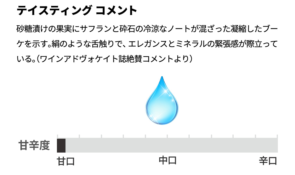 このワインは2018年にリリースされ、ワインアドヴォケイト誌から93点を獲得するなど高い評価を受けており、砂糖漬けの果実と冷涼なノートが混ざった凝縮したブーケを楽しめる。