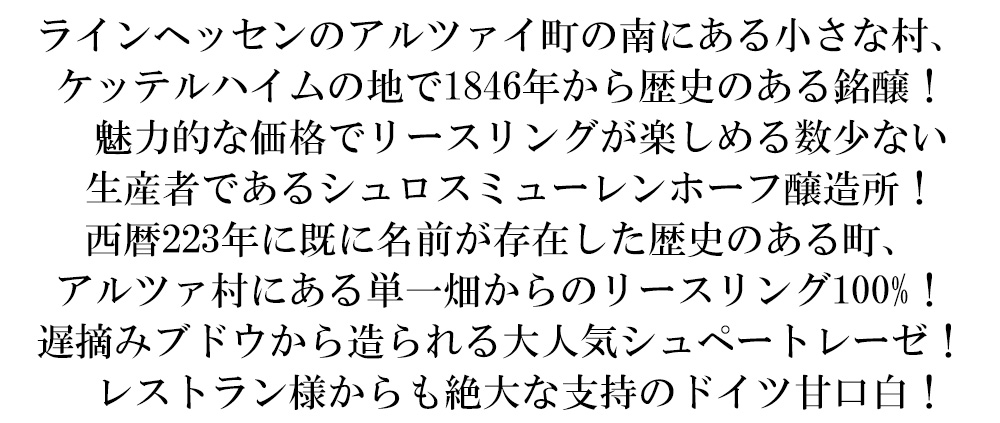 ドイツ・ラインヘッセン・アルツァ村の単一畑からの遅摘みブドウから造られる人気リースリング・シュペートレーゼが少量入荷!しかも魅力的な価格でリースリング100%が楽しめる数少ない生産者のひとりであるシュロスミューレンホーフ醸造所!