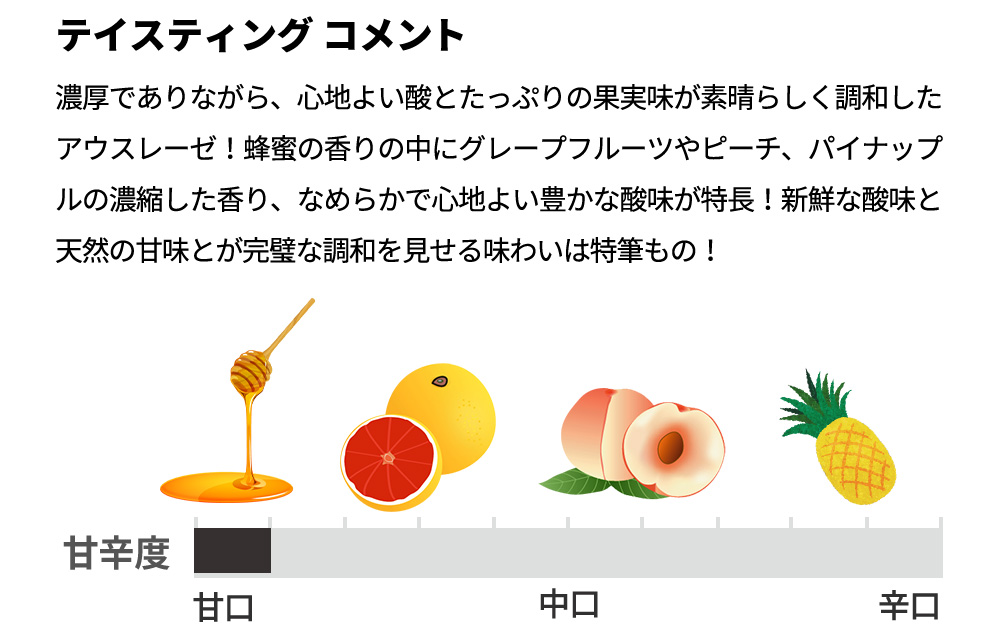 濃厚でありながら、心地よい酸とたっぷりの果実味が素晴らしく調和したアウスレーゼ!蜂蜜の香りの中にグレープフルーツやピーチ、パイナップルの濃縮した香り、なめらかで心地よい豊かな酸味が特長!新鮮な酸味と天然の甘味とが完璧な調和を見せる味わいは特筆もの!