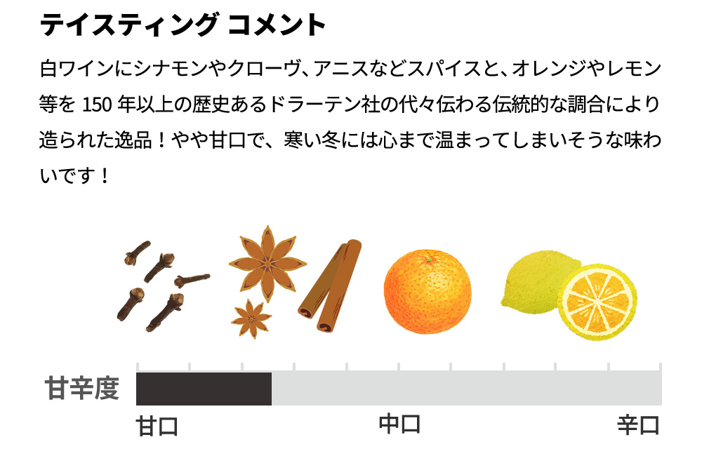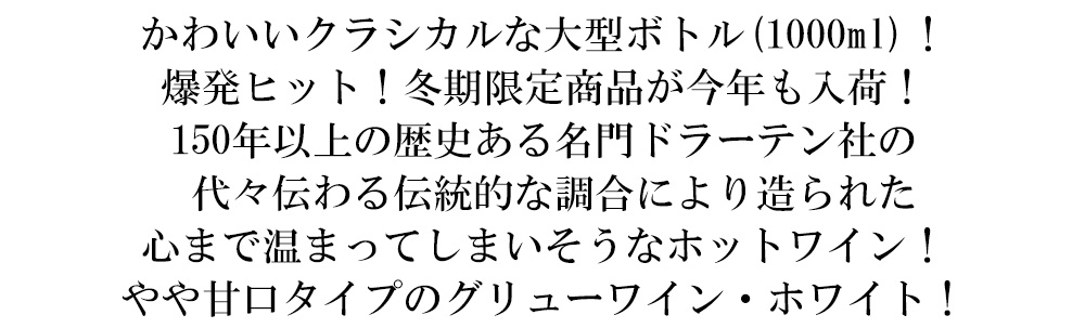 白ワインにシナモンやクローヴ、アニスなどスパイスと、オレンジやレモン等を150年以上の歴史あるドラーテン社の代々伝わる伝統的な調合により造られた逸品!やや甘口で、寒い冬には心まで温まってしまいそうな味わいです!しかもかわいいクラシカルなボトルに入って限定少量入荷!マグカップや耐熱容器に移し、電子レンジ500Wで45~60秒!または、お鍋に直接ワインを入れて沸騰させないように温めてお召し上がりください!