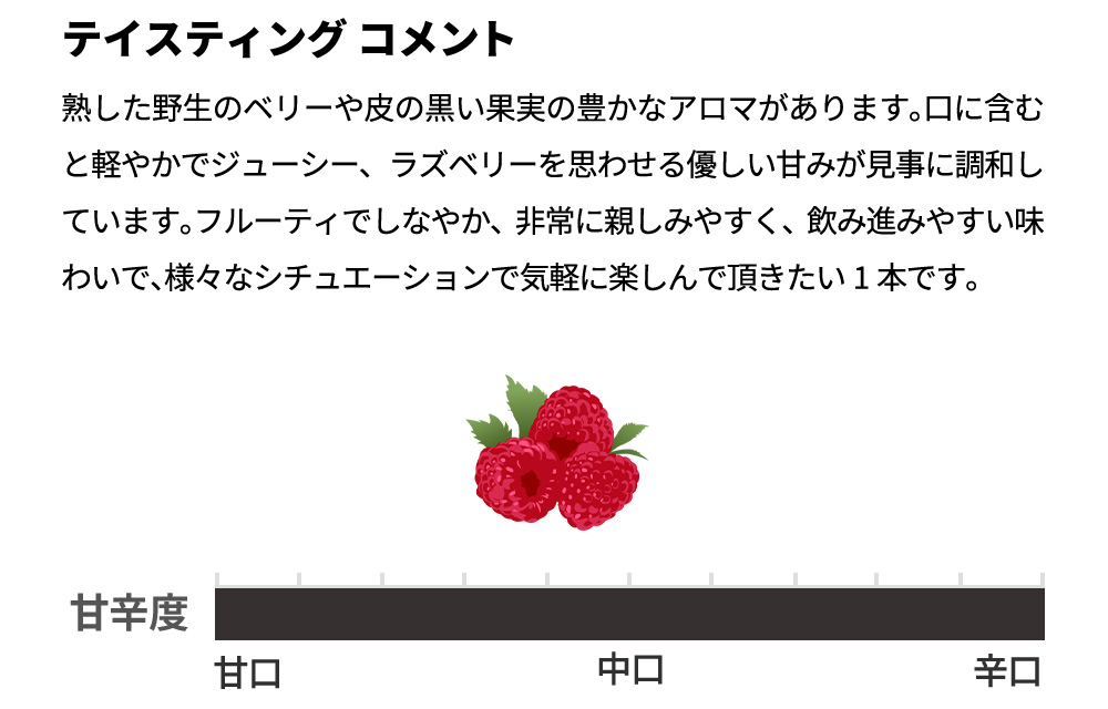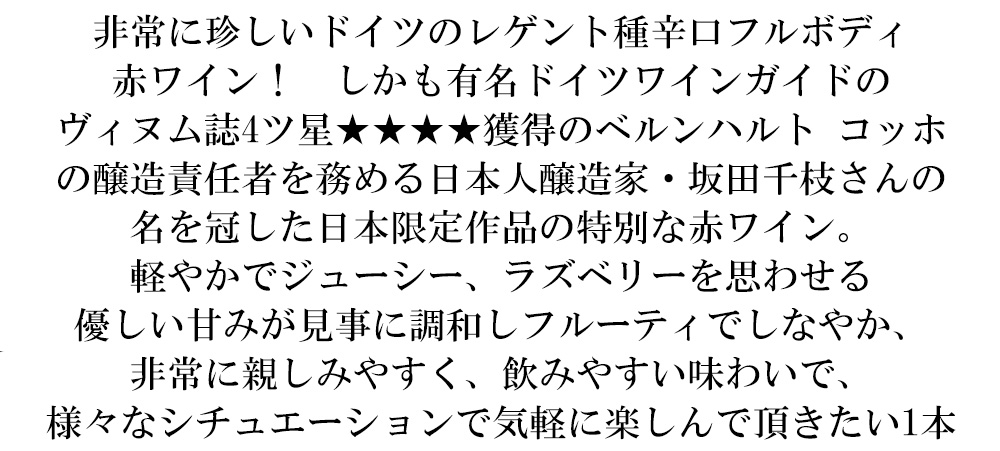 熟した野生のベリーや皮の黒い果実の豊かなアロマがあります。口に含むと軽やかでジューシー、ラズベリーを思わせる優しい甘みが見事に調和しています。フルーティでしなやか、非常に親しみやすく、飲み進みやすい味わいで、様々なシチュエーションで気軽に楽しんで頂きたい1本です。珍しいドイツのレゲント種100%フルボディ辛口赤ワインが限定で正規品の素晴らしい状態で少量入荷!