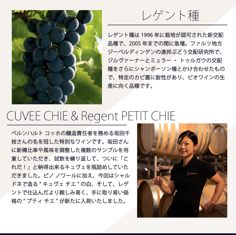 VT2019で「ゴーミヨドイツワインガイド誌2019」で赤4房、「ヴィヌム2019」で4つ星、「アイヒェルマン2019」で3つ星!バリックフォーラム所属!「DiejungPfalz2018」(ファルツの若いワイン生産者コンテスト)でアレクサンダーが総合部門で、2016VTシュペートブルグンダーが品種別で、最高点を獲得し1位獲得!まさに今、旬の生産者!から醸造責任者を務める坂田千枝さんの名を冠した日本のみ限定作品の特別な白ワイン『きれいな果実味に、しっかりとボリュームがあるシャルドネ』!