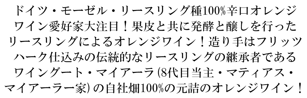 モーゼルのリースリングが持つ高い酸と、残糖を抑えた辛口の味わいに、タンニンが加わることで調和のとれた味わいに仕上げられたリースリング種の可能性を示す味わい深いオレンジワイン!
