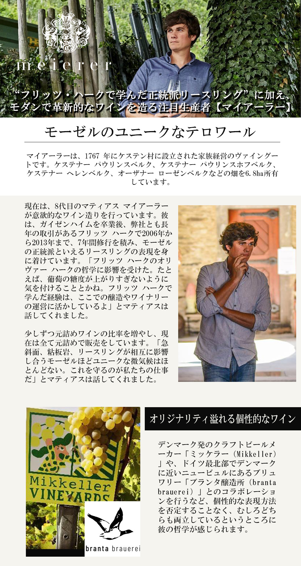 フリッツ ハーク仕込みの伝統的なリースリングの継承者であり、モーゼルのユニークなテロワールを表現するワイングート・マイアーラ(8代目当主・マティアス・マイアーラー家)の自社畑100%の元詰ワイン!