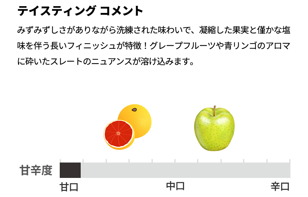 平均樹齢40年のブドウを使用した、溌剌とした酸と甘味とのバランスが素晴らしい逸品。ブルースレートが主体で、デヴォン紀の青粘板岩、粘土、腐植土が混じった土壌からは骨格のある酸とはっきりとしたミネラルの後味が特徴的です。グレープフルーツや青リンゴのアロマに砕いたスレートのニュアンスが溶け込みます。