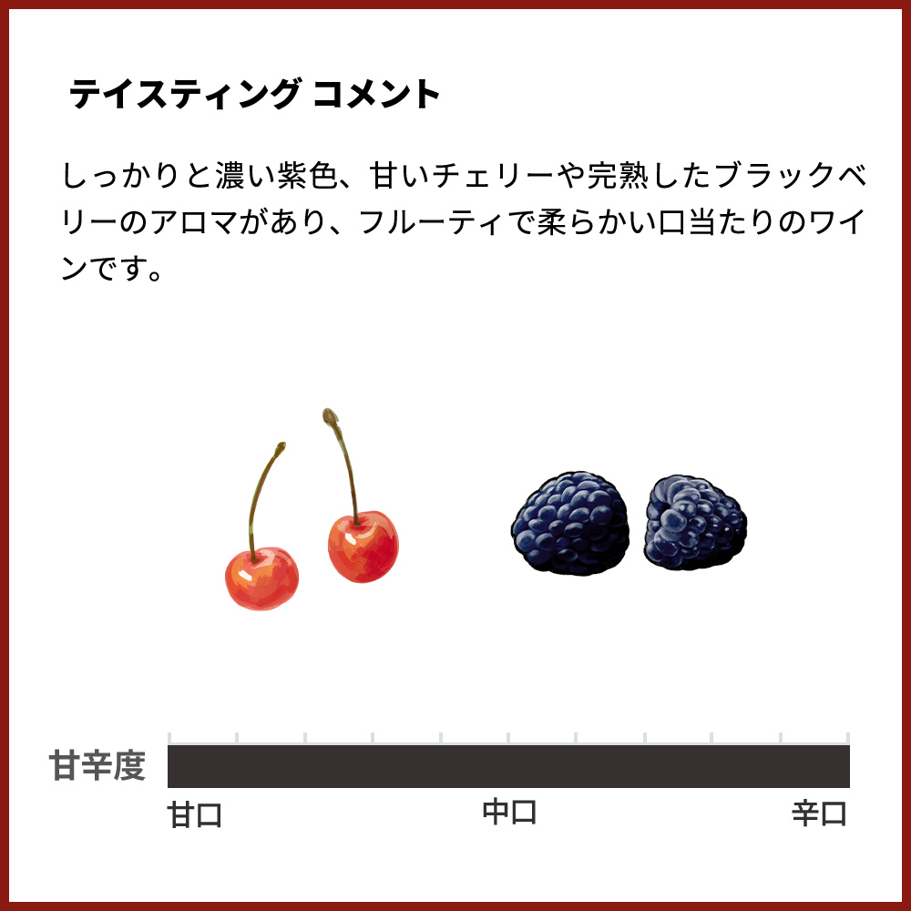 しっかりと濃い紫色、甘いチェリーや完熟したブラックベリーのアロマがあり、フルーティで柔らかい口当たりのワインです。もちろん現地のセラー数ヶ月前の蔵出し作品で正規品で限定入荷!