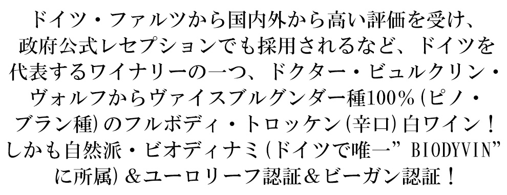 ドイツ・ファルツから国内外から高い評価を受け、政府公式レセプションでも採用されるなど、ドイツを代表するワイナリーの一つ、ドクター・ビュルクリン・ヴォルフから人気のヴァイスブルグンダー種100%(ピノ・ブラン種)のフルボディ・トロッケン(辛口)白ワイン!
