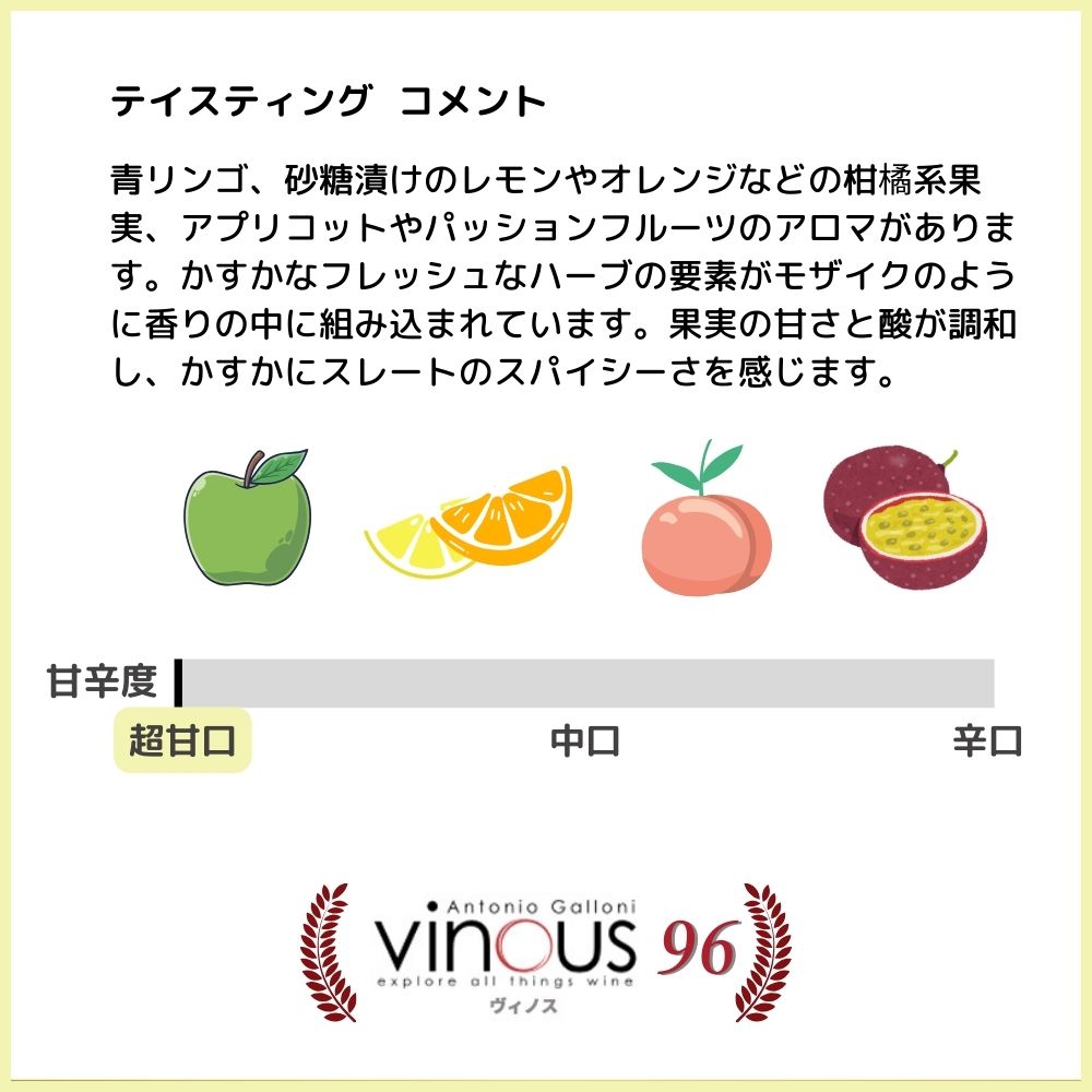 トロピカルフルーツを思わせる素晴らしい果実味、ハチミツ、様々な花やライムの皮を思わせる繊細なアロマとフレイバーが広がる。繊細なボディ、ミネラルの要素、きりりとした酸がこのワインに素晴らしい熟成のポテンシャルを与えている。
