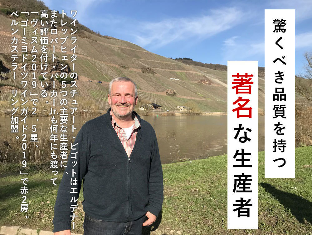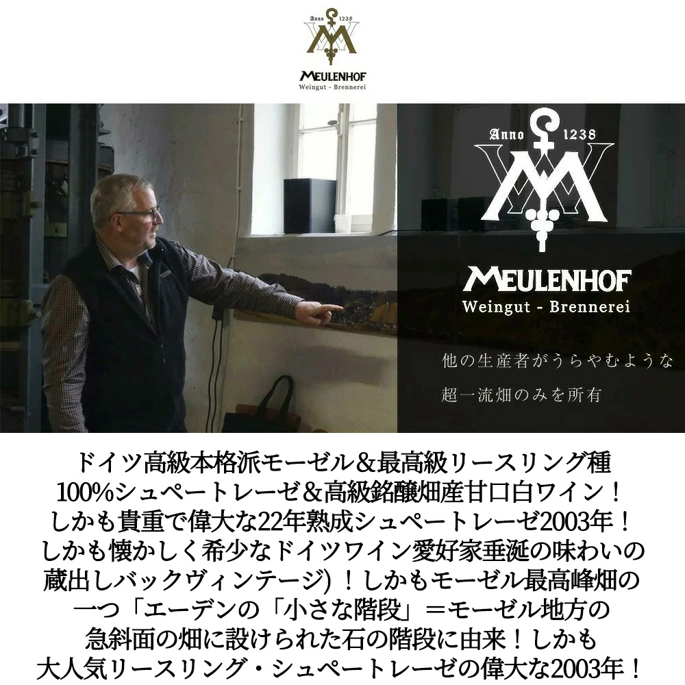 造り手は、ロバート・パーカーやスチュアート・ピゴット氏がエルデナー・トレプヒェンの5つの主要な生産者に挙げ大注目!しかも1337年より歴史のある人気生産者であり、モーゼルのクラシックな味筋を守る数少ない生産者として評価されるワイングート・ミューレンホフ (オーナー ステファン・ユステン氏) によるシュペートレーゼ!
