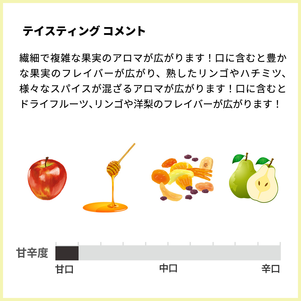 繊細で複雑な果実のアロマが広がります!口に含むと豊かな果実のフレイバーが広がり、熟したリンゴやハチミツ、様々なスパイスが混ざるアロマが広がります!口に含むとドライフルーツ、リンゴや洋梨のフレイバーが広がります!熟成していますが、まだフレッシュな果実味が保たれており、果実味と酸が素晴らしく調和したシュペートレーゼです!