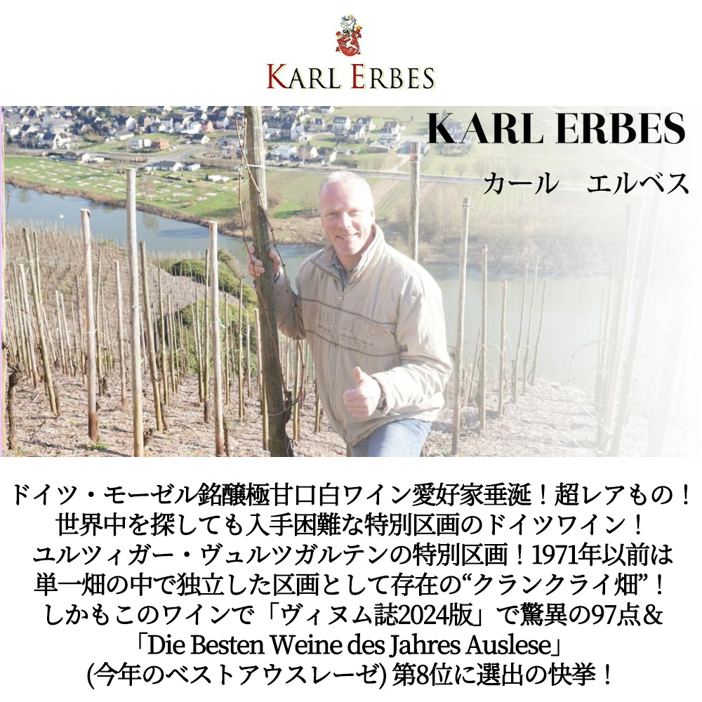 ユルツィガー・イン・デア・クランクライ・リースリング・アウスレーゼ・★(シングルスター)・[2022]年・蔵出し限定作品・カール・エルベス元詰・幻の特別区画ユルツィガー・ヴュルツガルテン・“クランクライ”(かつてはトップクラスの単一畑として認められていた究極畑100%&フィロキセラ禍を生き延びた、接ぎ木をしていない樹齢100年を超えるリースリングを含む)((残糖驚異の134.9g/L・酸度:9.9g/L))・「ヴィヌム誌2024版」で驚異の97点&「Die Besten Weine des Jahres Auslese」(今年のベストアウスレーゼ)第8位