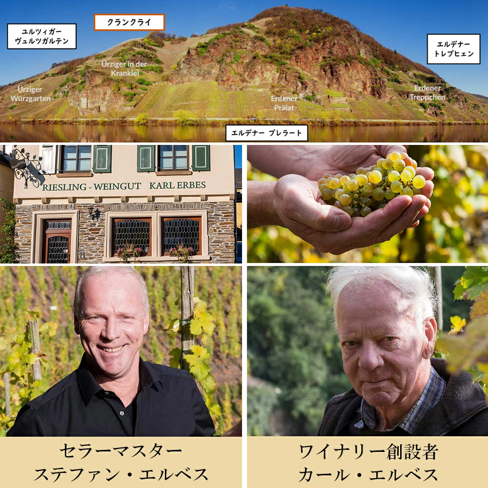 クランクライは、プレラートとユルツィヒの間に位置し、エルベスが所有するのはプレラート側です!1971年に新しいワイン法が制定される以前は、ヴュルツガルテン内の単一畑として独立していました!その後、表示が出来なくなっていましたが、2014ヴィンテージから再びラベルに表示することが法律で認められました! (クランクライはかつて非常に知名度の高い単一畑でしたが、1971年に改定されたワイン法によって、ユルツィガー ヴュルツガルテンに統合されました。この畑の葡萄の中にはフィロキセラ禍を生き延びた、接ぎ木をしていない樹齢100年を超えるリースリングが残っています。エルベス家ではこの区画を特別に扱い、単独でワインを造っています。’14VTから再び畑名を公に表示することが出来るようになりました。最大1,000Lの樽を使い、9-10度で発酵させています。)