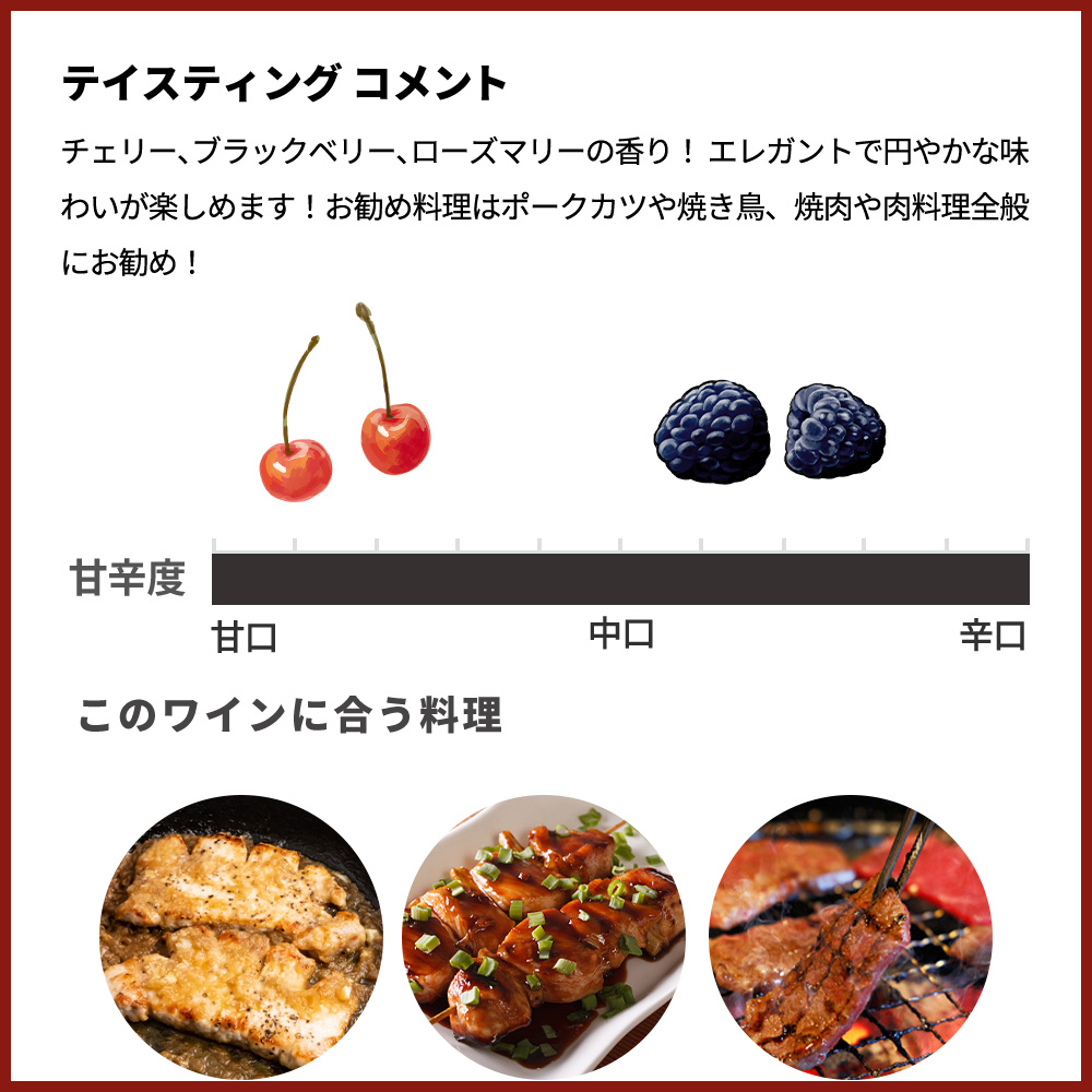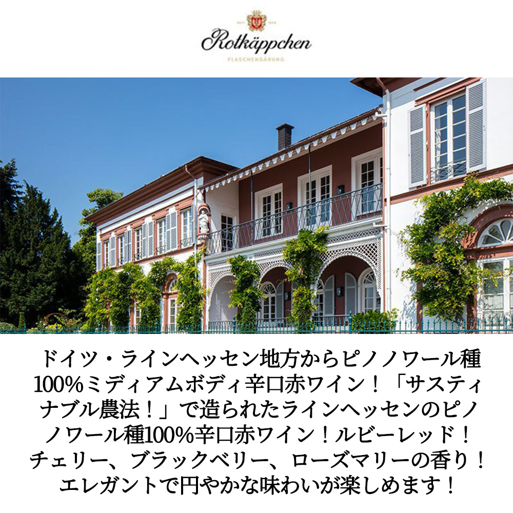 ルビーレッド!チェリー、ブラックベリー、ローズマリーの香り! エレガントで円やかな味わいが楽しめます!お勧め料理はポークカツや焼き鳥、焼肉や肉料理全般にお勧め!適温16-18度 (もう少し低めでもOK) 品種:ピノノワール。ミディアム。QBAラインヘッセン