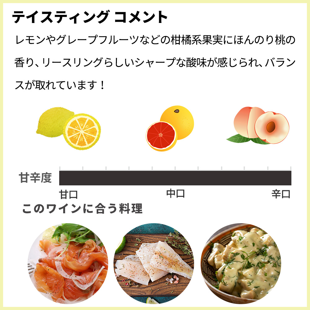 さわやかな酸味があり、キリッとした辛口です!フレッシュな辛口!レモンやグレープフルーツなどの柑橘系果実にほんのり桃の香り、リースリングらしいシャープな酸味が感じられ、バランスが取れています!