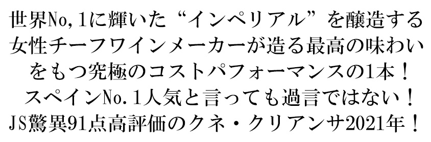 スペイン辛口赤ワイン愛好家大注目!造り手は、スペインの高級ワイン産地リオハに、エウセビオとライムンドのレアル・デ・アスア兄弟により1879年に設立されたCompania Vinicola del Norte de Espana(北スペインワイン会社)C.V.N.E.社!1879年創立当初、ワインラベルに社名「C.V.N.E.」と印刷するところを、単純なスペルミスで印刷された「CUNE」が気に入り、それ以来「クネ」の名で親しまれ、創業以来「最高のワインを造る」という精神のもと、スペインを代表するワイン造りを続けるクネ!C.V.N.E.社は、スペインで最初に電気の通った村のひとつであるHaro(アロ)を本拠地とし、リオハ・アルタとリオハ・アラベサ地区に4つのワイナリーを所有し、本拠地のリオハ・アルタにはC.V.N.E.社のはじまりであるこのワインCune(クネ)や最高峰フラッグ・シップのインペリアルを生産!4つのワイナリーの醸造家は、ほぼ全員が女性醸造家であり、醸造責任者も女性が務める!限定せずとも、結果としてほぼ女性で構成された醸造家チームの手掛けるワインは、エレガントでフレッシュなスタイルに仕上がっています!このクネ・クリアンサは、クネの果実味溢れるスタンダードワイン!この2021年でジェームス・サックリング驚異91点でコメントは「フルーティーでふくよかなノーズは、チェリー、イチゴ、スパイスの香り。熟し、歯ごたえがあり、果実味を表現したミディアムボディの味わいは、しっかりとした噛み応えのあるタンニンで丸みを帯びている。複雑味はないが、余韻の長さがある。」と大注目!ワインアドヴォケイト90+点でコメントは「2021年のクネ・クリアンサは、リオハ・アルタ産のテンプラニーリョに15%のガルナッチャとマスエロがブレンドされたクラシックなワインで、20,000リットルのステンレスタンクで発酵後、使用済みのアメリカンオーク樽と少量のフレンチオーク樽で12ヶ月間熟成される。クリーミーな香りに、野生のベリーやハーブのニュアンスがあり、フレッシュさをもたらす。アルコール度数13.5%、pH3.61、酸度5.4グラムで瓶詰めされた。親しみやすく調和がとれており、非常に繊細なタンニンを持ち、飲みやすくフレッシュでありながらグリップもある。」!ペニン・ガイド90点高評価!樹齢30~40年のテンプラニーリョ85%、ガルナッチャ及びマスエロ15%をマロラクティック発酵の後、225Lのアメリカンオーク樽で12ヶ月熟成で造られる傑作品!口当たりはエレガントで、かつ若々しいスパイスの香りとバランスの良い酸味が見事に調和!最高の味わいをもつ究極のコストパフォーマンスをもつ1本!スペインNo.1人気と言っても過言ではない大人気クネ・クリアンサの大人気ヴィンテージ[2021]年で待望の入荷!