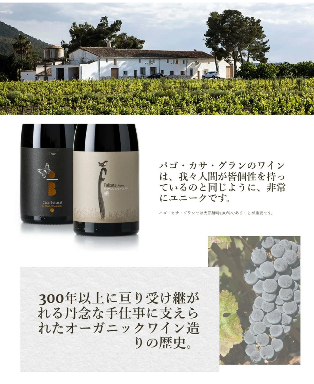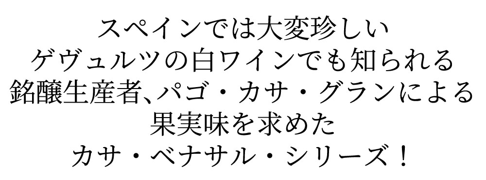 カサ・ベナサル ゲヴゥルツトラミネール・モスカテル 2023年 パゴ・カサ・グラン■ 葡萄品種:モスカテル75%/ゲヴュルツトラミネール25%■アルコール度数:12.5% ■ 飲み頃温度:10℃■ 土壌:砂質(ミュスカ)、白粘土(ゲヴュルツ)■ 発酵・熟成:ステンレスタンク発酵・ステンレスタンク熟成6ヶ月(シュール・リー)■ オーガニック情報:ビオロジック(CAECV認証)オレンジやグレープフルーツ、ベルガモットのような華やかな香りや桃やアーモンドを思わせるふくよかなニュアンスもある。酸味と厚みの絶妙なワインです。【祖父から母へ。母から息子へと代々受け継がれたドイツの品種、ゲヴュルツトラミネール】スペインでは珍しいゲヴュルツトラミネールは祖父がドイツから持ち込んだものです。母の手によりワインとなりましたが、ワイナリー経営は一時中断。2004年に息子のカルロスが、母の想いを受け継いでワイン造りを再興しました。