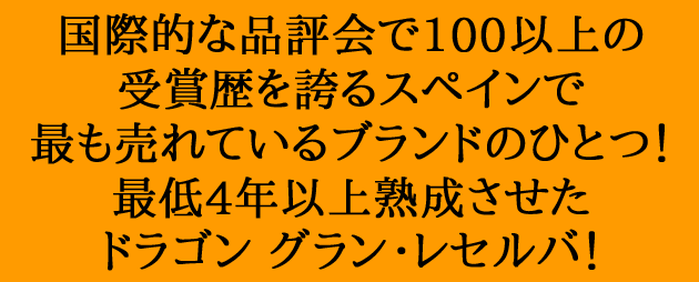 ドラゴン グラン・レセルバ 2014年 ボデガス・ベルベラーナアルコール発酵はステンレスタンクで行います。熟成はアメリカンオークの3年樽とフレンチオークの2年樽で4年行います。熟成中、半年に1回澱引きをします。それぞれの樽からのワインをブレンドし、しばらく休ませてからボトリングします。輝きのある明るいチェリーレッド。樽熟成によるアーモンドやチョコレート、バニラ、コーヒーのアロマ。口に含むと非常にバランスが良く、甘く丸みのあるタンニンが感じられます。様々な要素が混ざりあった複雑さのある余韻があります。