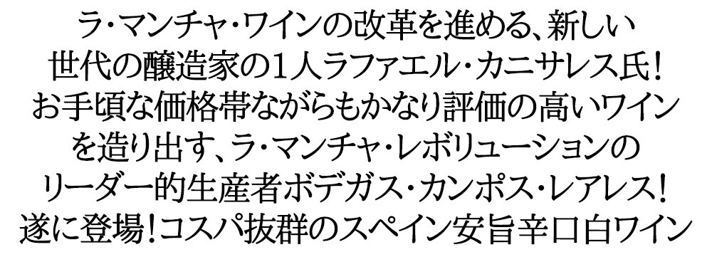ドーニャ テレサ ブランコ NV ボデガス カンポス レアレス社 SC 造り手は1950年に設立した協同組合が事業拡大の後、1988年に地元の生産者と共にボデガス・カンポ・レアレス社を形成。 ラ・マンチャの伝統を踏まえた上で、最新の技術を積極的に取り入れてきました!ワインメーカーはラ・マンチャワインの改革を進める新しい世代の醸造家の一人、ラファエル・カニサレス氏が担当! マーケティング及び広報担当は、国際市場とワイン造りに精通しているホセ・アントニオ・イダルゴ氏!ワインを熟知したスタッフもワイナリーの特徴で、お手頃な価格帯ながらもかなり評価の高いワインを造り出す、まさにラ・マンチャ・レボリューションのリーダー的な生産者。畑は大陸からの影響を受ける地中海性気候。 植密度2200本/ha!自然環境に優しい葡萄栽培を実践!収穫は9月から10月頃実施! 醸造・熟成はステンレスタンクにて、24℃の温度管理で4日間発酵、マセレーションは行わない!ワインはグリーンアップルを彷彿させるフレッシュな香りと、爽やかで口当たりの良い、親しみやすい辛口ワインに仕上がった極旨スパニッシュです。