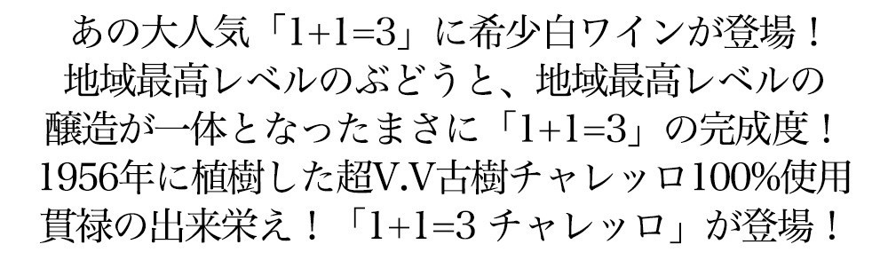 1+1=3 チャレッロ 2023年 栽培・醸造をトップレベルで一貫させた相乗効果として誕生した、従来のものとは次元が異なるカヴァ「1+1=3」で有名、スペインの2人の名門のコラボによる究極スパニッシュ! スペインのこの価格帯のワインでは珍しく、すべて手摘みで収穫し、ぶどうを厳しく選別!除梗100%! スキンコンタクト後、ステンレスタンクのみで発酵・熟成! 薔薇の花、カーネーション、マンゴ、桃、リンゴ、グレープフルーツ、レモンなど、フルーツの盛り合わせのような楽しいアロマに、たっぷりとした果実味!きれいな酸が特徴の傑作スパニッシュ白。 ペネデスのトップワイナリーと言われる「カン・ラフォルス・デルス・カウス」のノウハウを結集させた、貫禄の出来栄え1+1=3 チャレッロ!