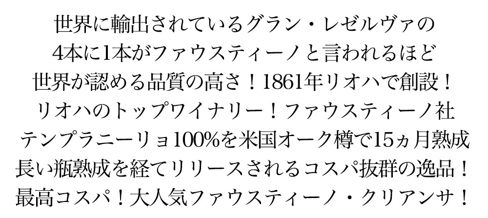 ファウスティーノ クリアンサ 2019年 厳選したテンプラニーリョ100%をアメリカンオーク樽で15ヵ月熟成! さらに瓶熟24ヵ月でリリースされるコスパ抜群の逸品!クリーンでブライト、熟成による若干の栗色! エレガントでトースティなアロマ、しっかりとした構成で余韻も長い素晴らしい味わい! もちろん正規品の蔵出し品の素晴らしい状態で少量入荷!お勧め料理はステーキ肉等の肉料理全般やツナや鱈のグリル、熟成タイプのチーズなどと相性抜群!