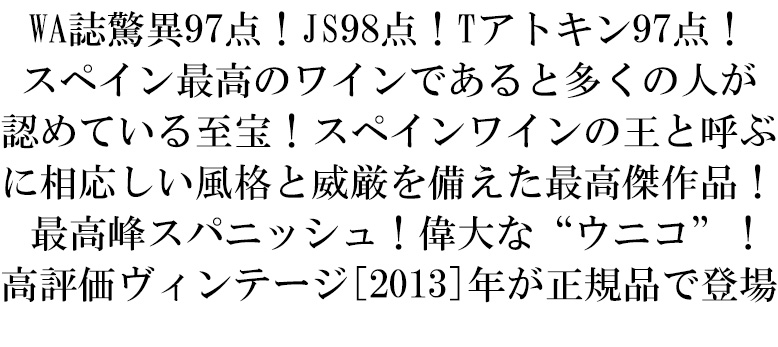 ウニコは10年未満のブドウは使わず、しかも収穫から10年以上の熟成を終えないとリリースしないという究極のこだわり!スペインがこれまで生み出したものの中で最高のワインであると多くの人が認めている至宝!正規品の素晴らしい状態で限定で極少量入荷!