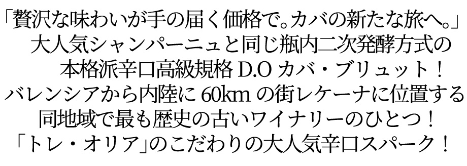 バレンシアから内陸に60kmの街レケーナに位置するトレ・オリアは、同地域で最も歴史の古いワイナリーのひとつです。オリア・デ・ルエダ家は元々絹織物で事業を起こしましたが、1897年に事業を変更してワイン造りに力を注ぐことを決意し、トレ・オリア・ワイナリーを設立しました。また、ペネデス以外の地域でカバD.O.の原産地呼称を冠することが許された初めての造り手として、歴史的な価値を持つワイナリーでもあります。