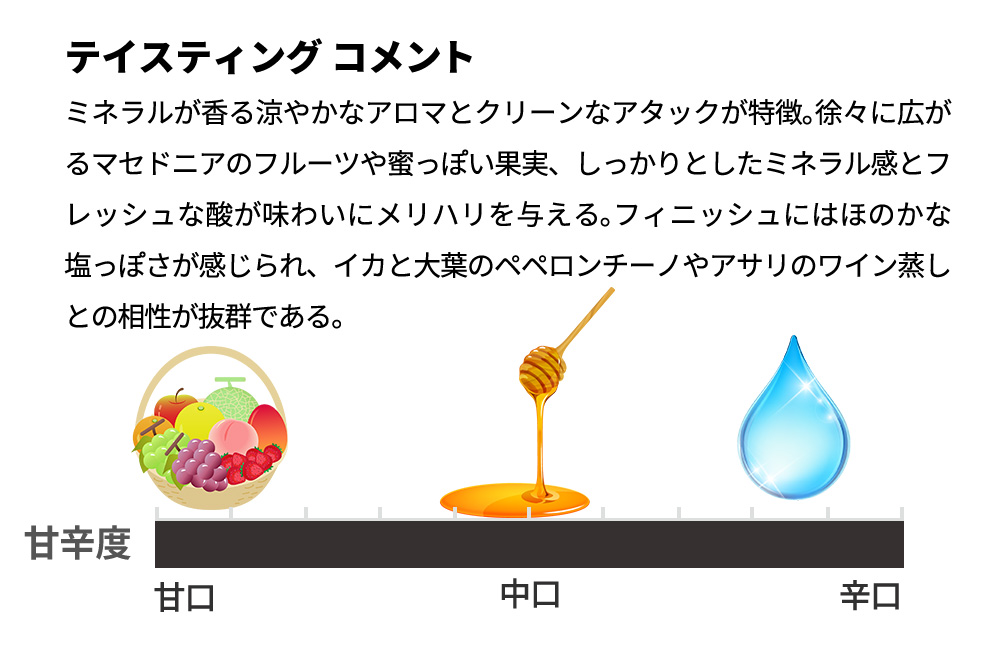 トマダ・デ・カストロのアルバリーニョは、スペインのD.Oリアス・バイシャス産で、アルバリーニョ種100%から造られる。この正統派の辛口白ワインは、ミネラルが香る涼やかなアロマとクリーンなアタックが特徴。徐々に広がるマセドニアのフルーツや蜜っぽい果実、しっかりとしたミネラル感とフレッシュな酸が味わいにメリハリを与える。フィニッシュにはほのかな塩っぽさが感じられ、イカと大葉のペペロンチーノやアサリのワイン蒸しとの相性が抜群である。