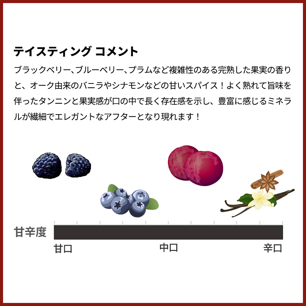 輝きのあるほのかに紫がかったルビーレッド!ブラックベリー、ブルーベリー、プラムなど複雑性のある完熟した果実の香りと、オーク由来のバニラやシナモンなどの甘いスパイス!よく熟れて旨味を伴ったタンニンと果実感が口の中で長く存在感を示し、豊富に感じるミネラルが繊細でエレガントなアフターとなり現れます!