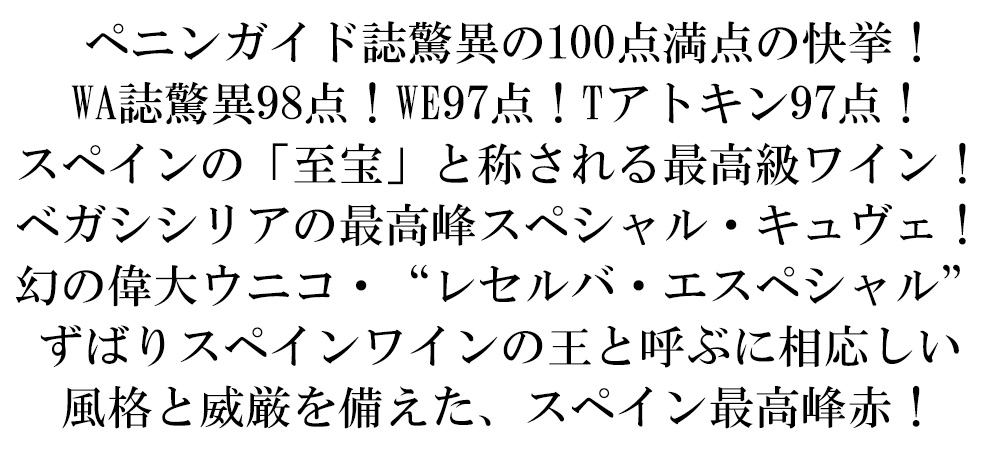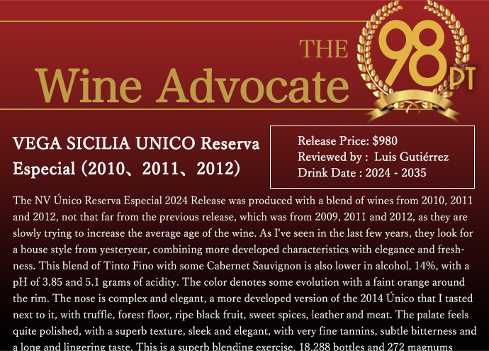 ワインアドヴォケイト誌でも驚異の98点獲得!『NV Unico Reserva Especial 2024リリースは、ここ数年見てきたように、彼らは往年のハウス・スタイルを模索し、より発展した特徴とエレガンスやフレッシュさを組み合わせている。香りは複雑でエレガント、トリュフ、森林の床、熟した黒い果実、甘いスパイス、革、肉の香り。味わいは非常に洗練されており、見事なテクスチャー、なめらかでエレガント、非常に繊細なタンニン、ほのかな苦味、長く続く余韻が感じられる。』と大絶賛コメント!